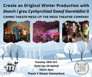 Join our Winter Show Development Day Tues 28th Oct and be at the heart of the process. No previous experience needed. 10am-4pm Theatr Y Glowyr Ammanford